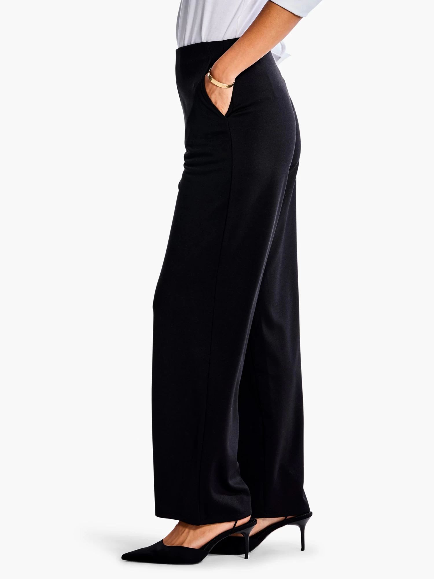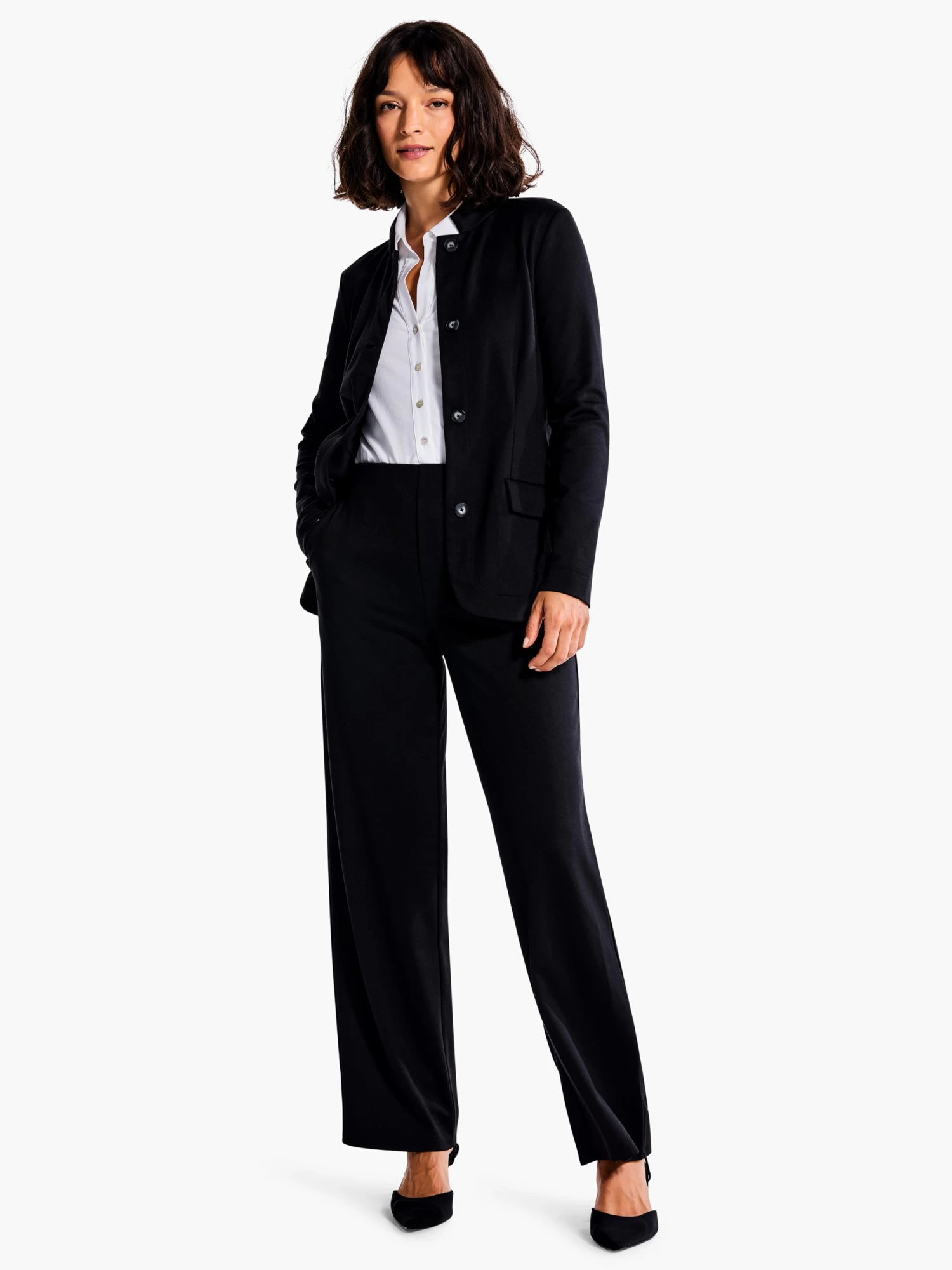 Long live the wide leg. In a silo we call The Artist, this easy wide leg straight leg silhouette is on-trend and at the front of our rotation for both dressy and casual styles. Sits just below the waist and is full length. Pair it with the Drapey Ponte jacket for a put-together set, or let it star in your own outfit.