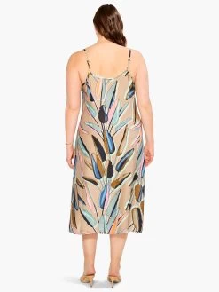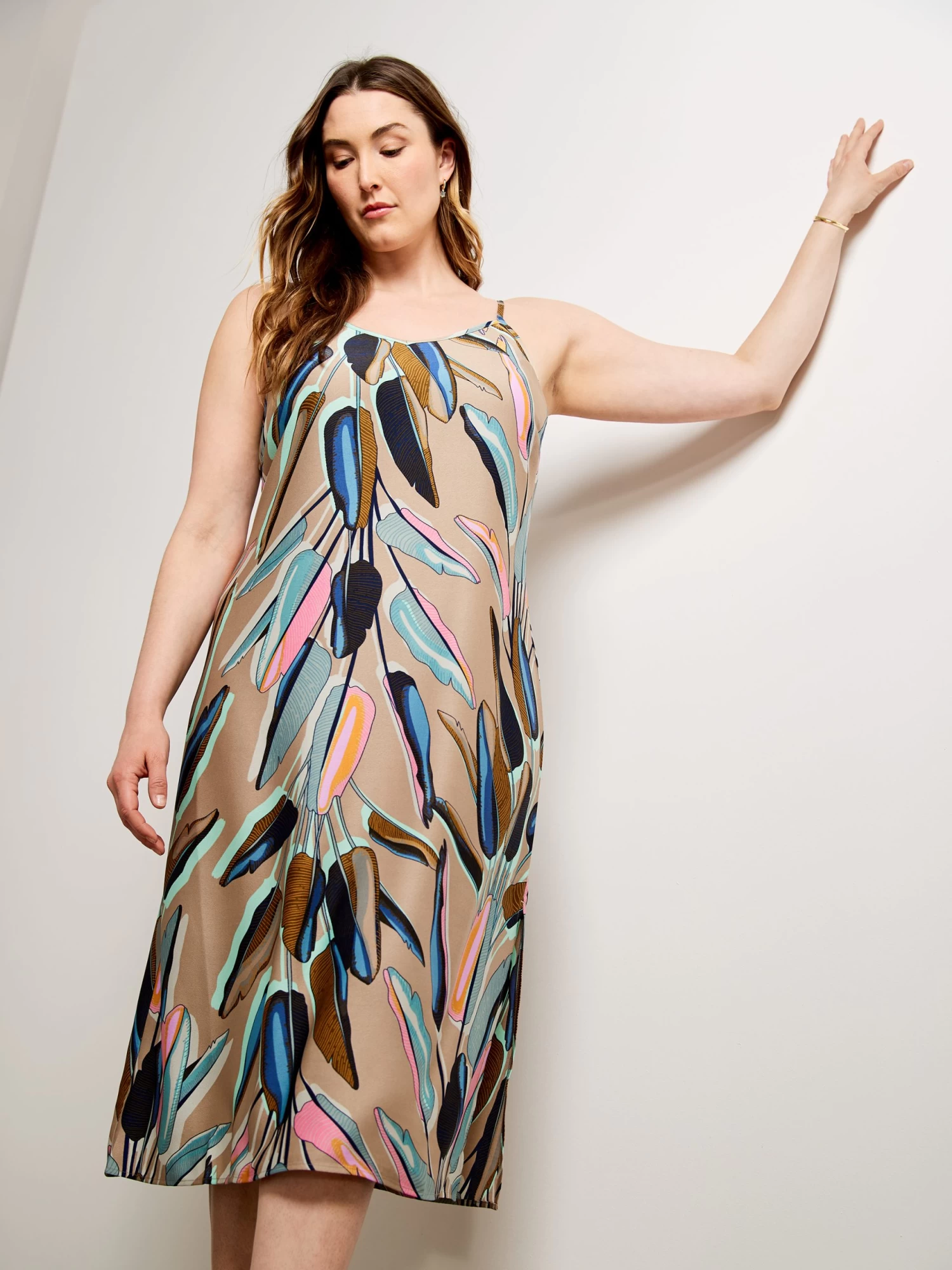 An on-trend slip silhouette featuring a print that effortlessly combines elegant neutral tones with a pop of tropical color and botanical design. We gave it easy sleeveless V-neck details with a hem that falls below the knee. With slim, secure straps. The feel is lightweight and the fabric is supremely drapey and smooth.