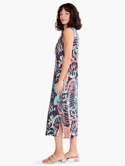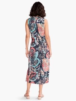Embrace the fun of life spent outdoors when you drape yourself in this unique artistic print from head to toe. Gathered fabric details create shape and comfort while the asymmetrical interplay of color and shape turns heads. Made from a light and breezy linen modal blend. An easy fitting sheath pullover silhouette. Sleeveless and designed to fall below the knee.