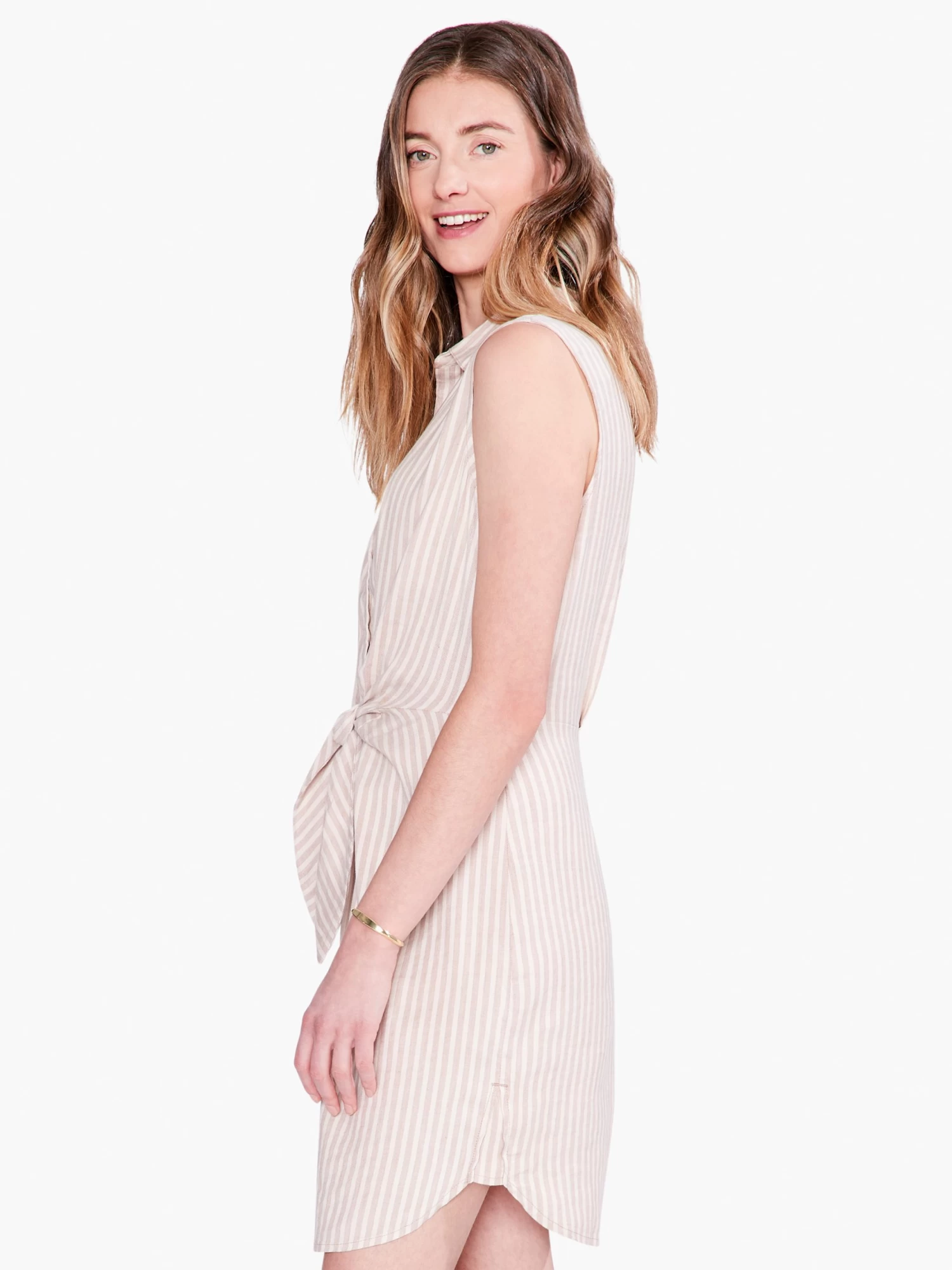 A woven shirt dress with a functional and adjustable tie front that gives you options on how to style it. Made from a breezy and breathable linen blend in a unique and accessible pinstripe pattern. With a classic shirt collar detail, no sleeves, and a hem designed to fall above the knee.