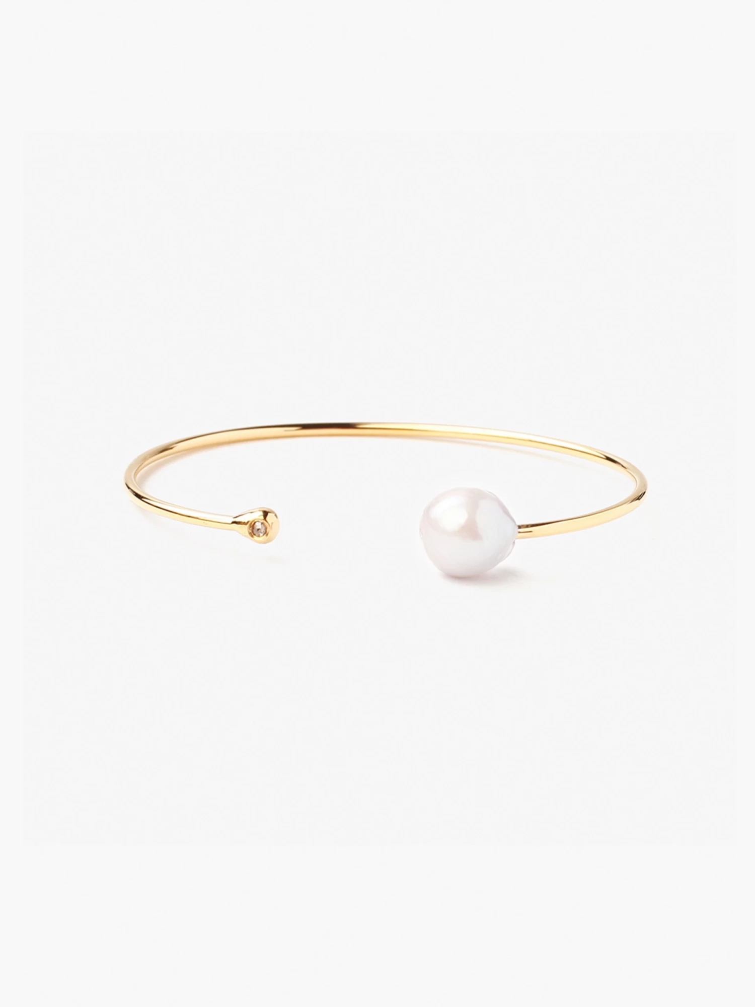 This sleek and classic cuff bracelet is composed of .03ct champagne diamond and an iridescent white freshwater pearl. Freshwater pearls are unique and one of a kind so sizes and shapes will vary.