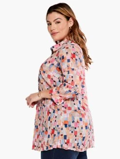 A collared button front top that’ll take you far: all the way to tunic length in fact. Wearing it as a top or a fun, swishy layer, we love this piece’s inviting geometric print. Made from 100% cotton with slight shirring detail at the hem and the cuffs. And it’s Mindfully Made, so you can feel as good about wearing it as you feel comfortable in it.