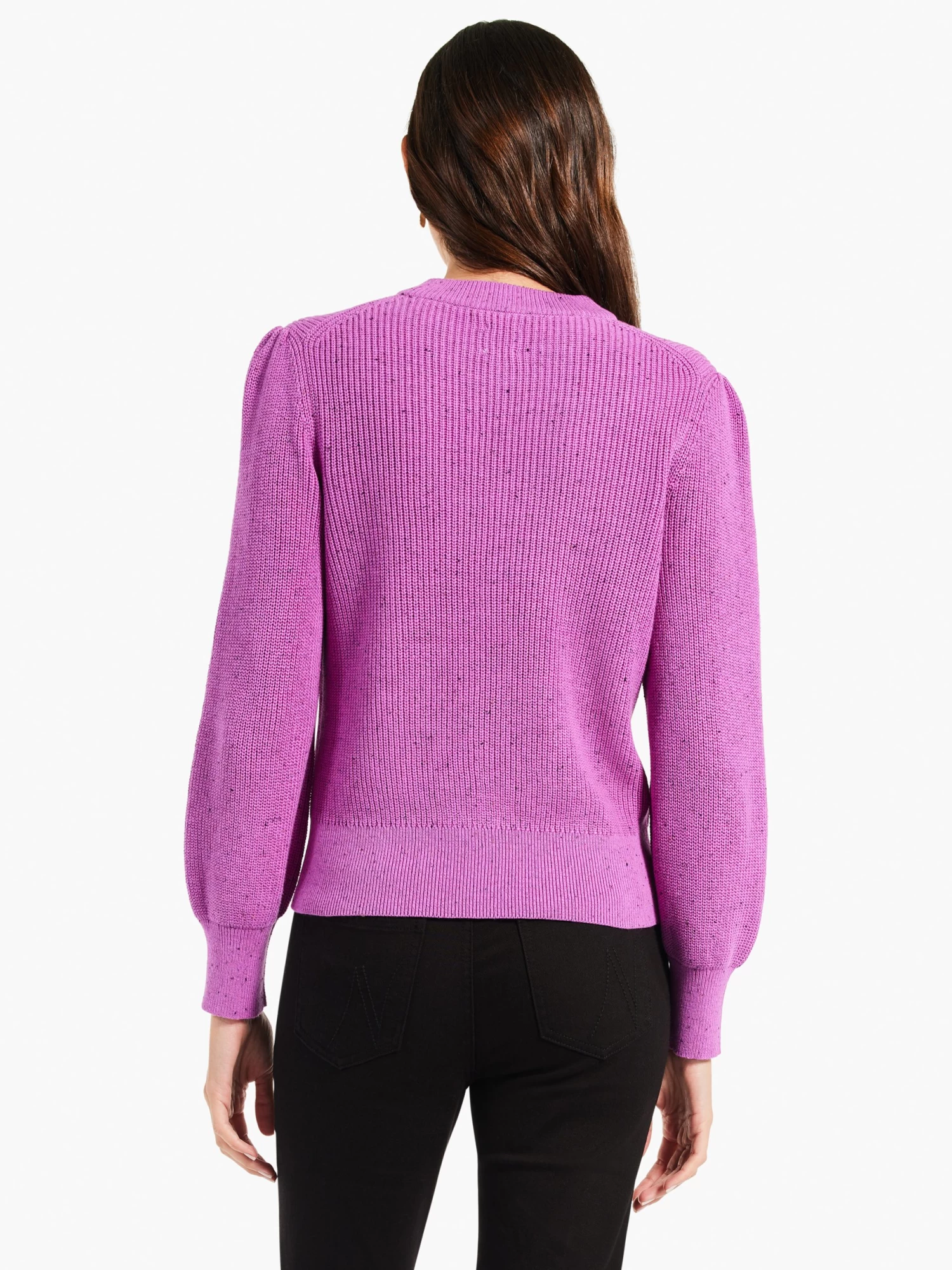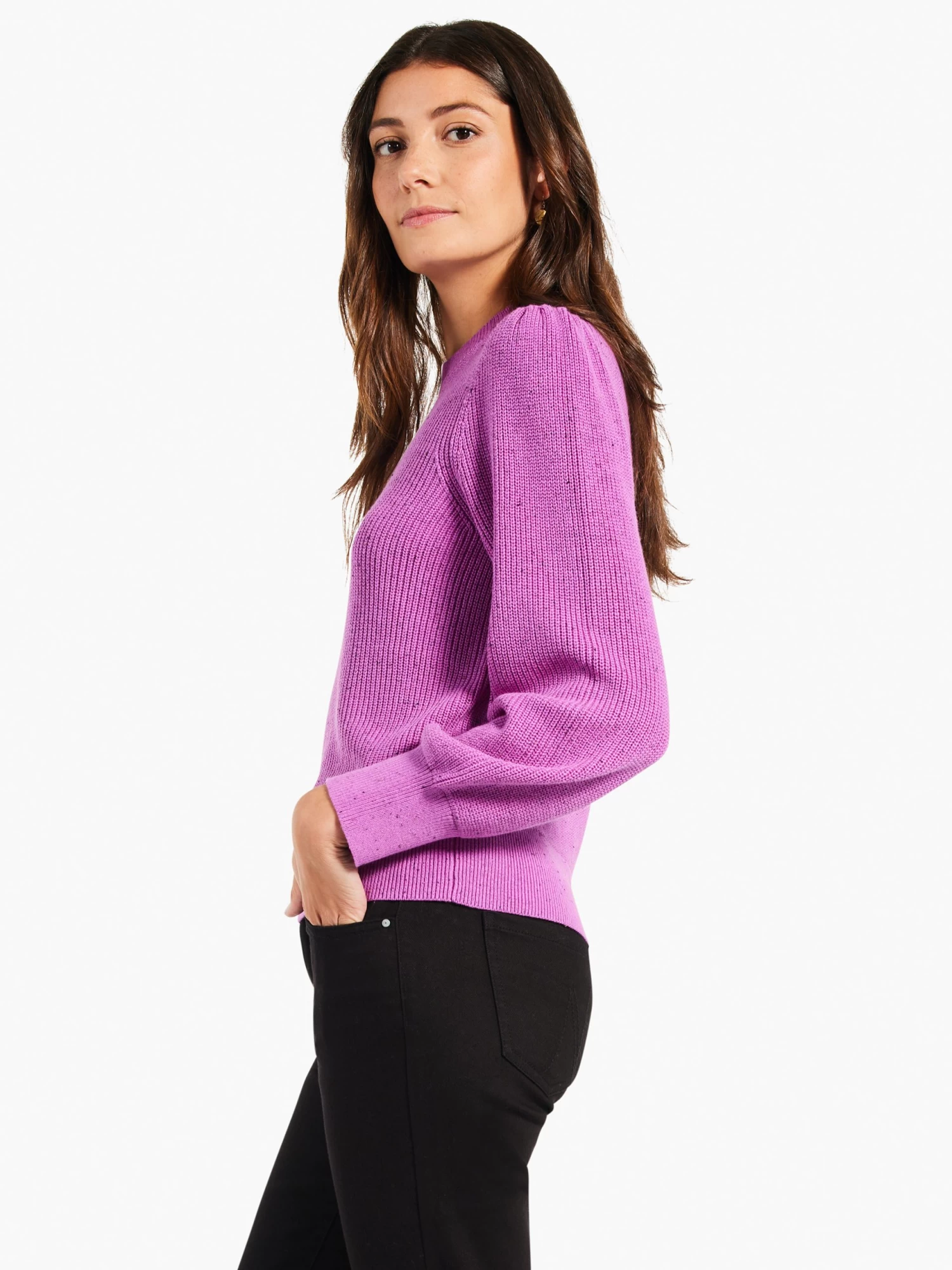 Our bestselling Vital yarn in classic cable knit stitch: this easy pullover with a little extra intentionality is the perfect thing to elevate your everyday. Details include the gathering at the top of the sleeve and a double-knit neck. Mindfully Made from “no waste” knitwear and partially made from recycled cotton yarns.