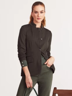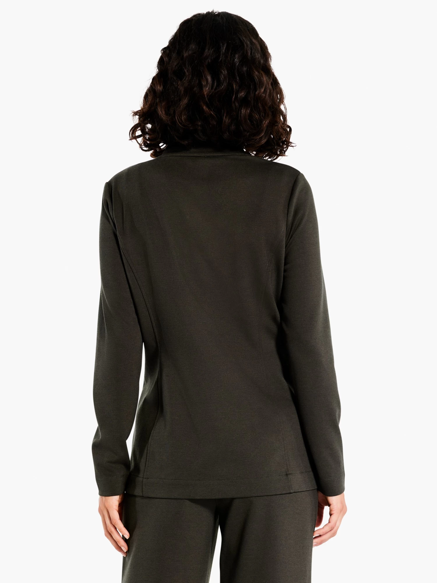A fashion jacket that’s as comfortable as your favorite top? It is possible. This cosmopolitan blazer features buttons all the way to the top, and an on trend stand collar in addition to its surprisingly drapey soft feel. Details include the smart button front, asymmetric flap pockets, and a smart short hem that sits at the hip.