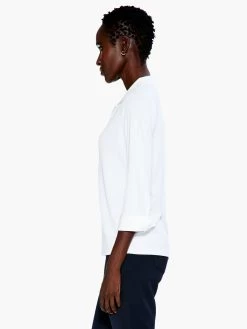 Elegant, simple, and clean with details that elevate in all the right places like 3/4 sleeves and the split neck that leads right into the shirt collar. A pullover designed to sit at the hip in a silhouette that’s not too loose or too tight, this top bridges the gap between the easy, dressy looks and casual looks that are just a little dressier. The feel is airy and bouncy, with just the right amount of added stretch.