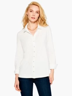 This essential shirt is your elevated, everyday layer and a personal favorite of our Founder + Chief Creative Officer, Dorian. The secret behind this chic shirt is the mixed media fabric, featuring elements of our matte satin for easy elegance and stretchy soft cotton in back for maximum comfort. The silhouette is flattering and feminine, it features a shirt collar, bracelet length sleeve and a button front. We love this for easy layering as well as a stand-alone style.
