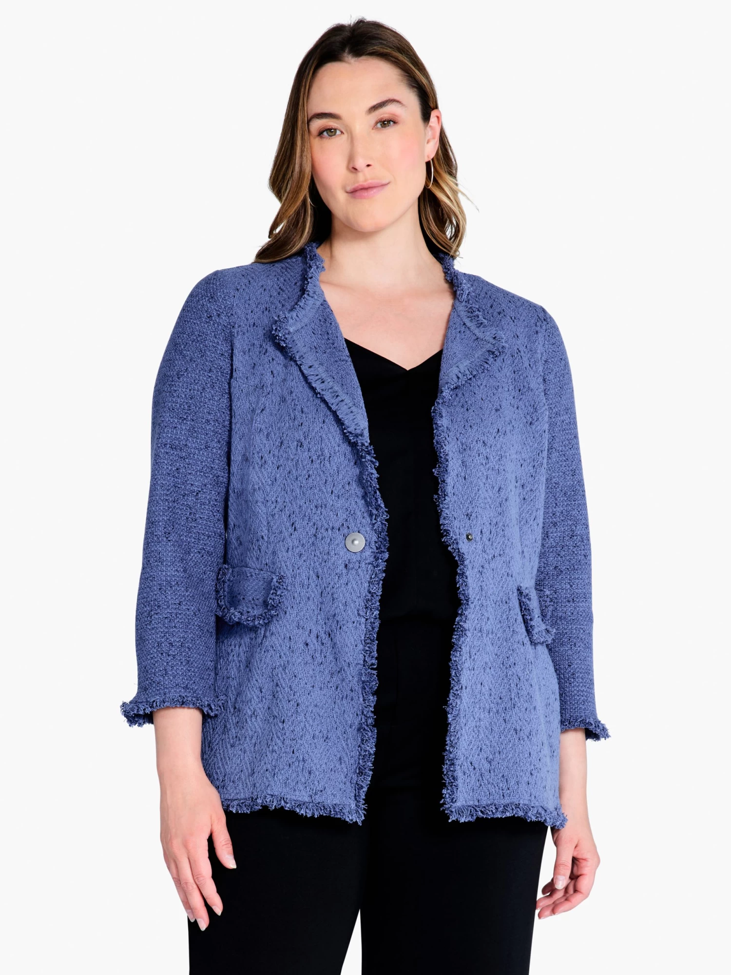 You can never have enough Fringe Mix. Introducing our ICO(NIC) Fringe Mix Blazer, a twist on the jacket, now with a longer hem and a couple of other key twists like the lack of buttons on the sleeves and the flat pockets. What’s stayed the same is what makes it great: the namesake fringe, and the knit sleeves/woven front still features, making this the comfiest jacket in your closet.