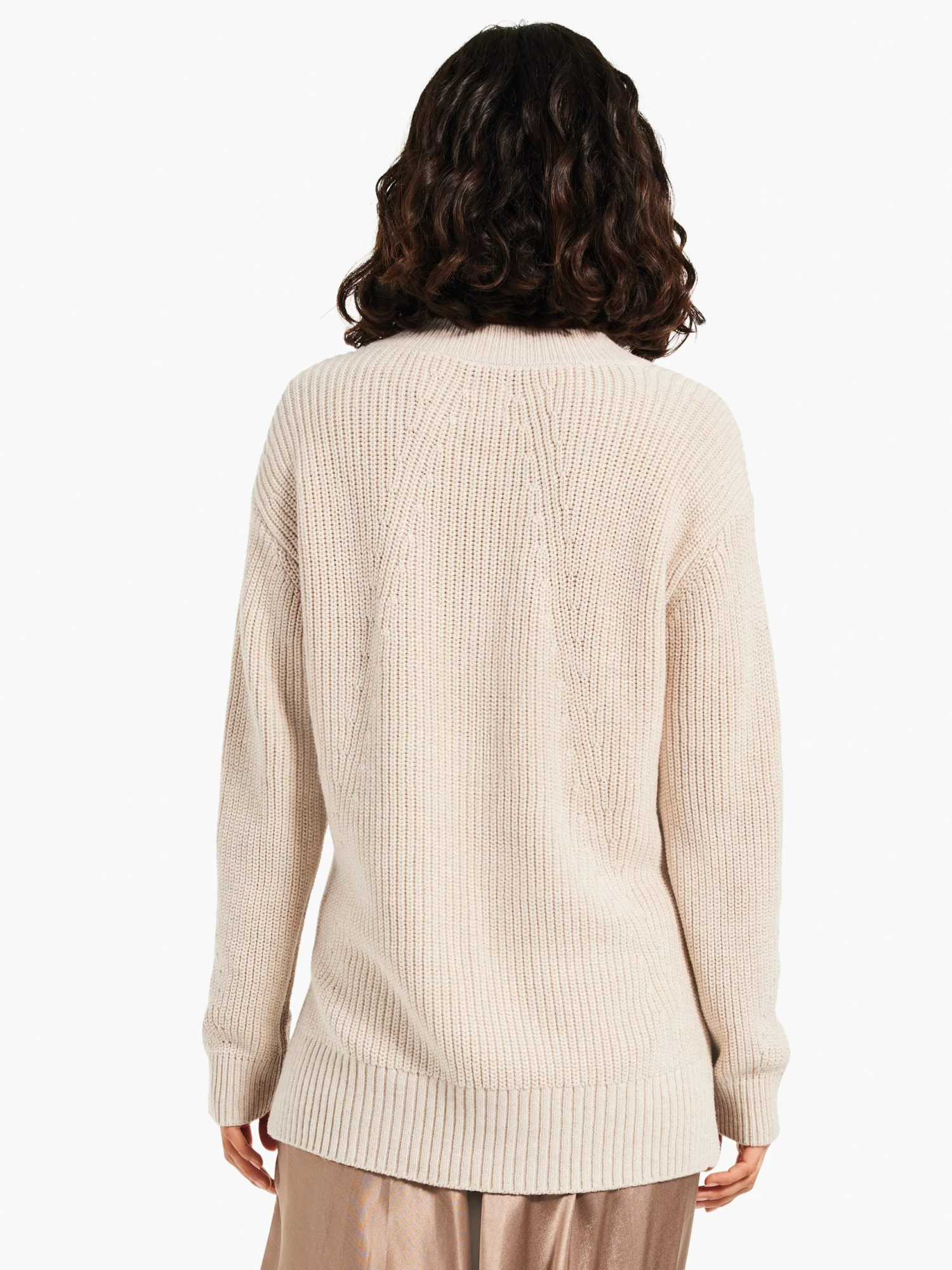 Neutral elegance with a touch of metallic shine, this elevated essential is an instant-classic thanks to its intricate detailing. Made with an on-trend modern shaker stitch, we also added with visible fashioning along the neckline and continued fashioning details along the back. Side slits make the fit roomy and breathable. The relaxed fit is modern and all day easy and features a little extra length to take the hem below the hip