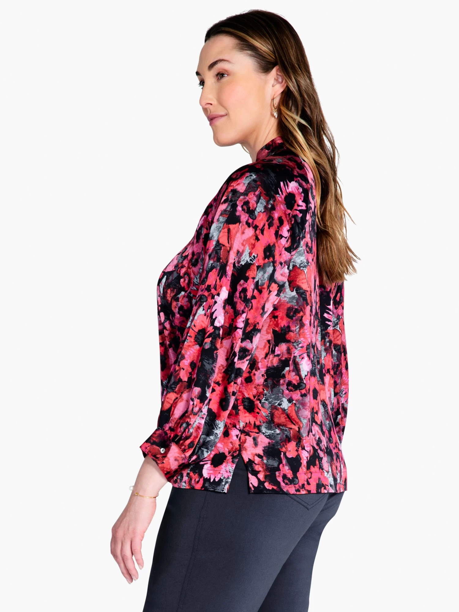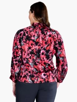 A rosy print that features both the fun of a color pop and the elevating drama of dark shades. But this wear-whenever top is more than just appearances: the comfy shape features a unique split neck, easy fit, bracelet cuffs, shaped raglan sleeves, and an easy hem that sits at the hip.