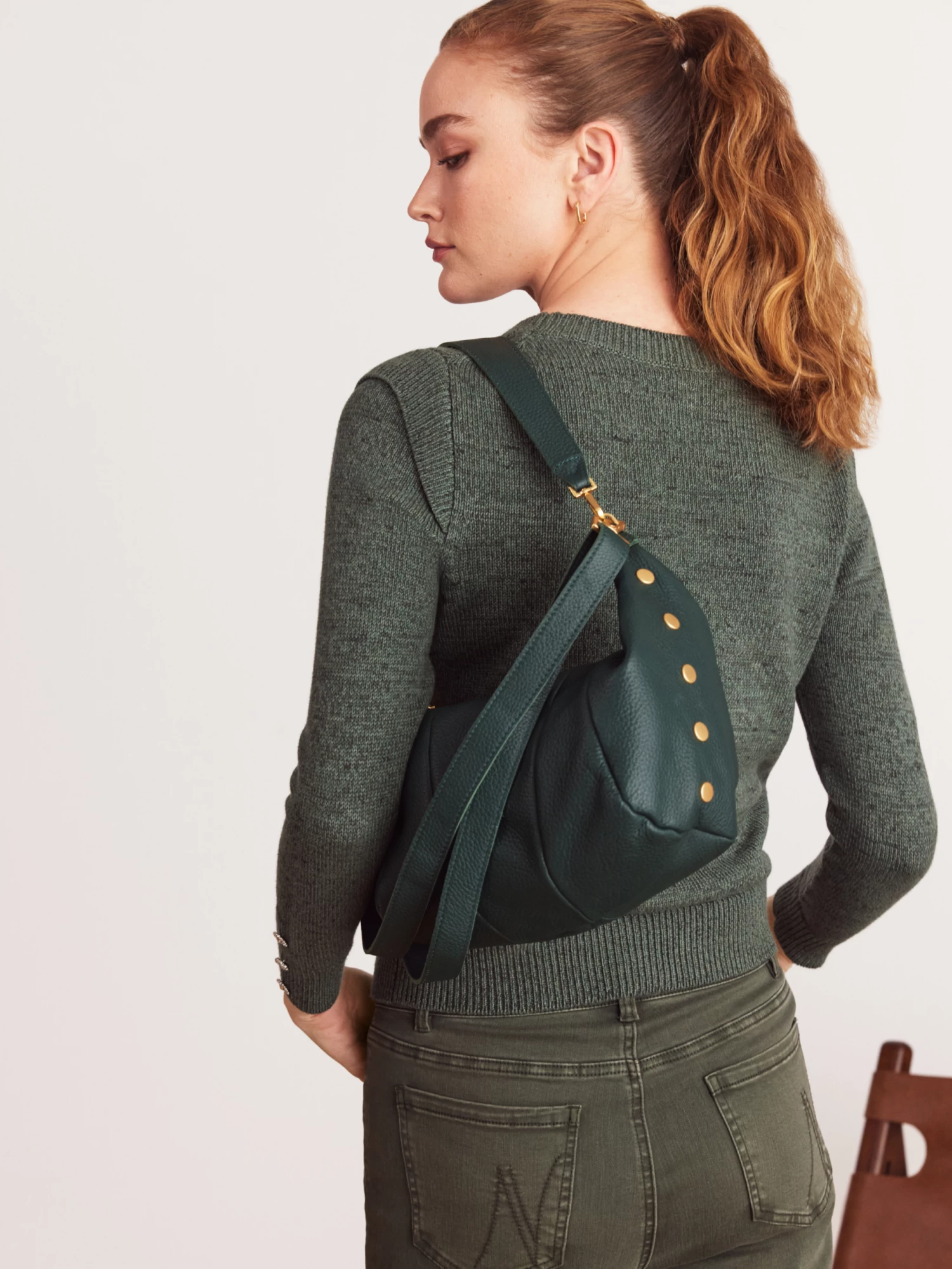 - Green pebbled leather. Brushed gold hardware. Cotton twill lining
