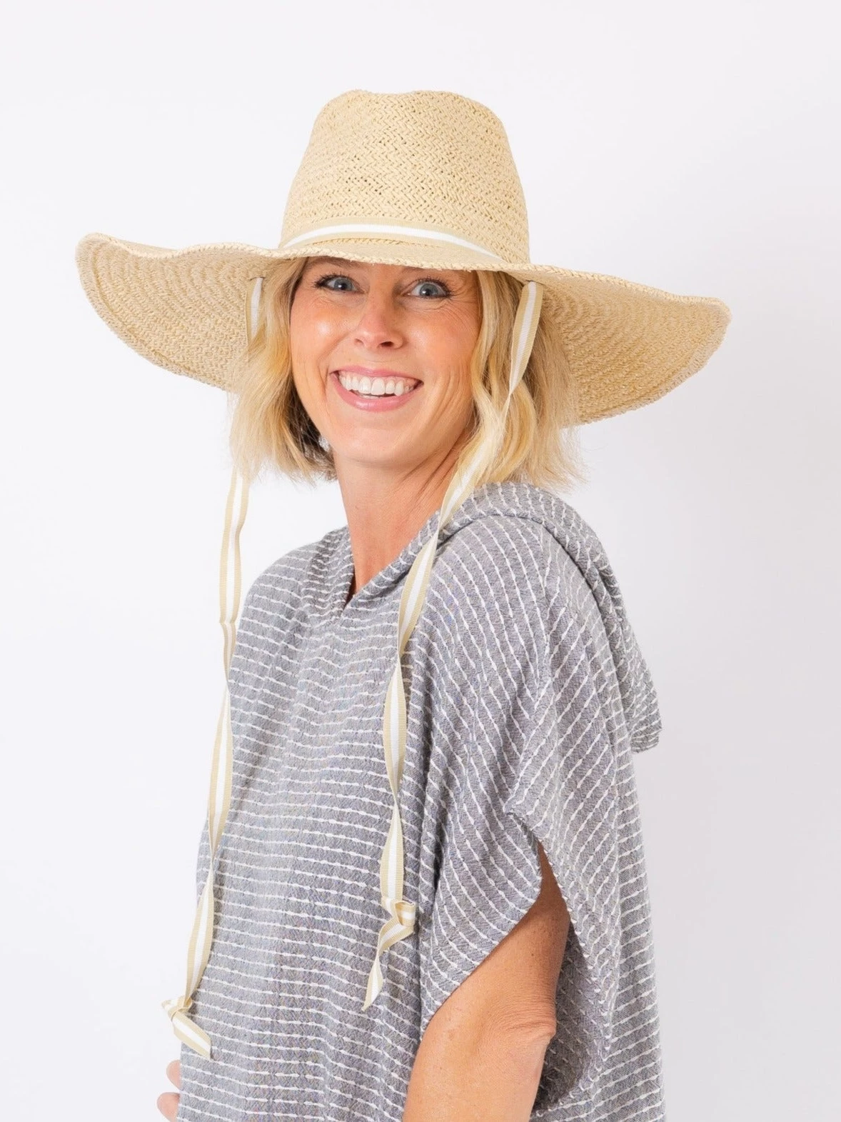 The Elle Chinstrap Hat is a timeless hat made from lightweight paper. It has a contrasting tan and ivory stripe ribbon detail that makes taking your hat on and off extra convenient! This hat is perfect for spending the day gardening, at the beach or running errands! Tie the ribbon to keep the hat secure on more windy days.