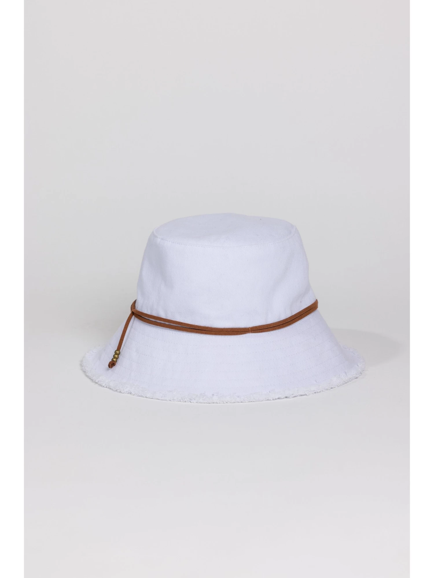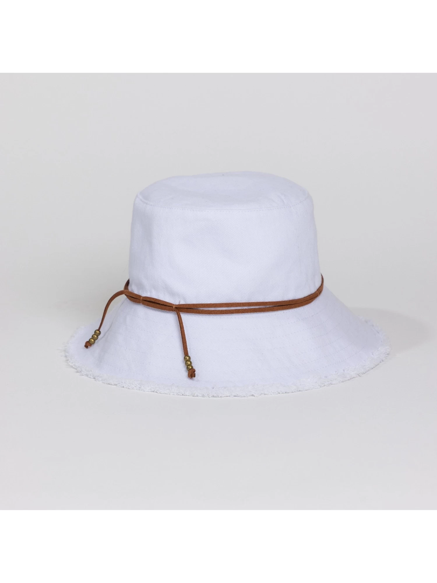 This staple washed cotton bucket hat with casual frayed edge and tie detail has added SPF Protection! An iconic look, bucket hat with frayed edge. Protect your face with this sun protection hat that can be packed in your suitcase.