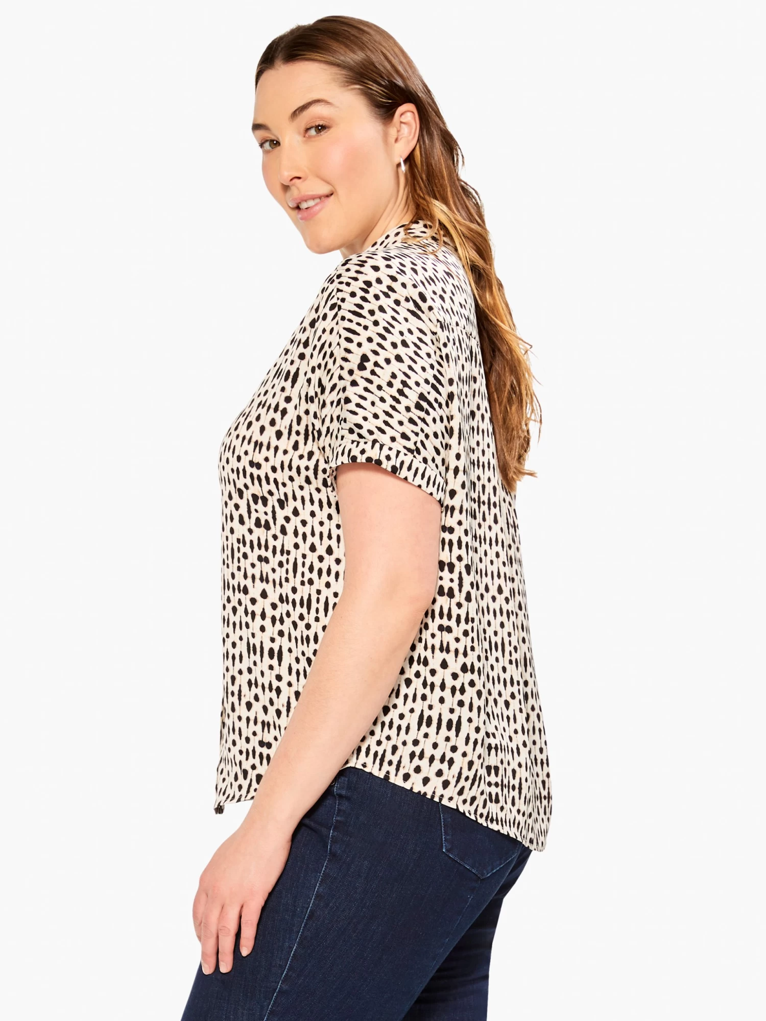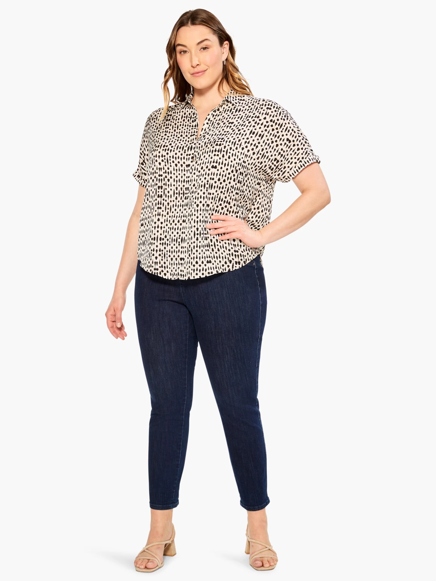 An easy fitting silhouette with a classic shirt collar but with a uniquely chic black and white ink spot design. Made with a classic button down front, but we recommend wearing it tied to lean into a warm weather cute casual outfit. Roll sleeve details finish look and keep you cool.