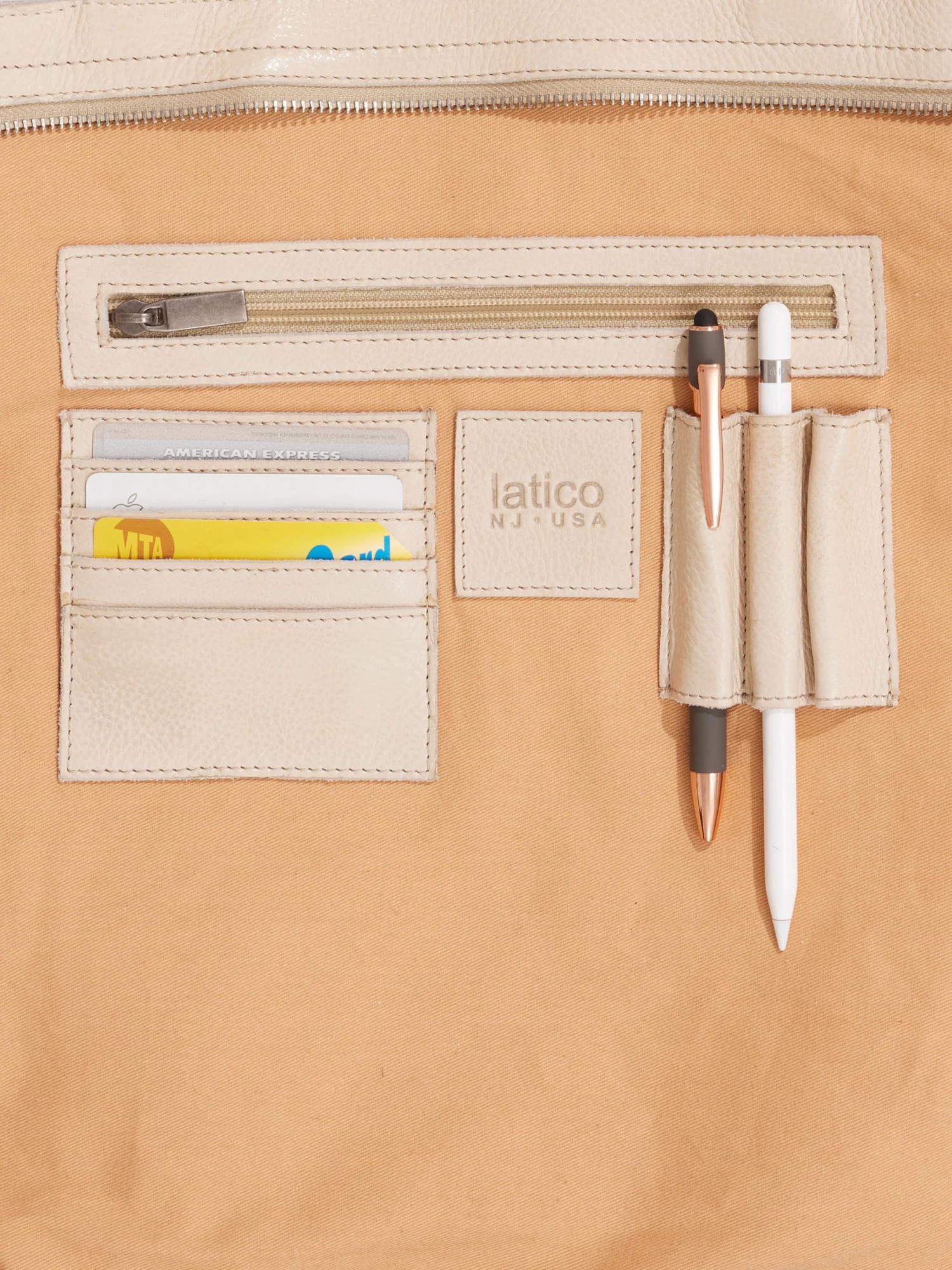 - Back wall zip pocket and organizer with 4 credit card slots and 2 pen/pencil holders