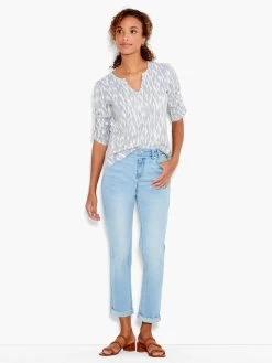 You’ve got your basic tees down, now add some flair. We love this piece’s unique split neck and easy silhouette, but it’s really all about the rouching details on the elbow sleeves and the complementary blue and white pattern. Made from a 100% breathable, durable cotton slub. Sits at the hip.