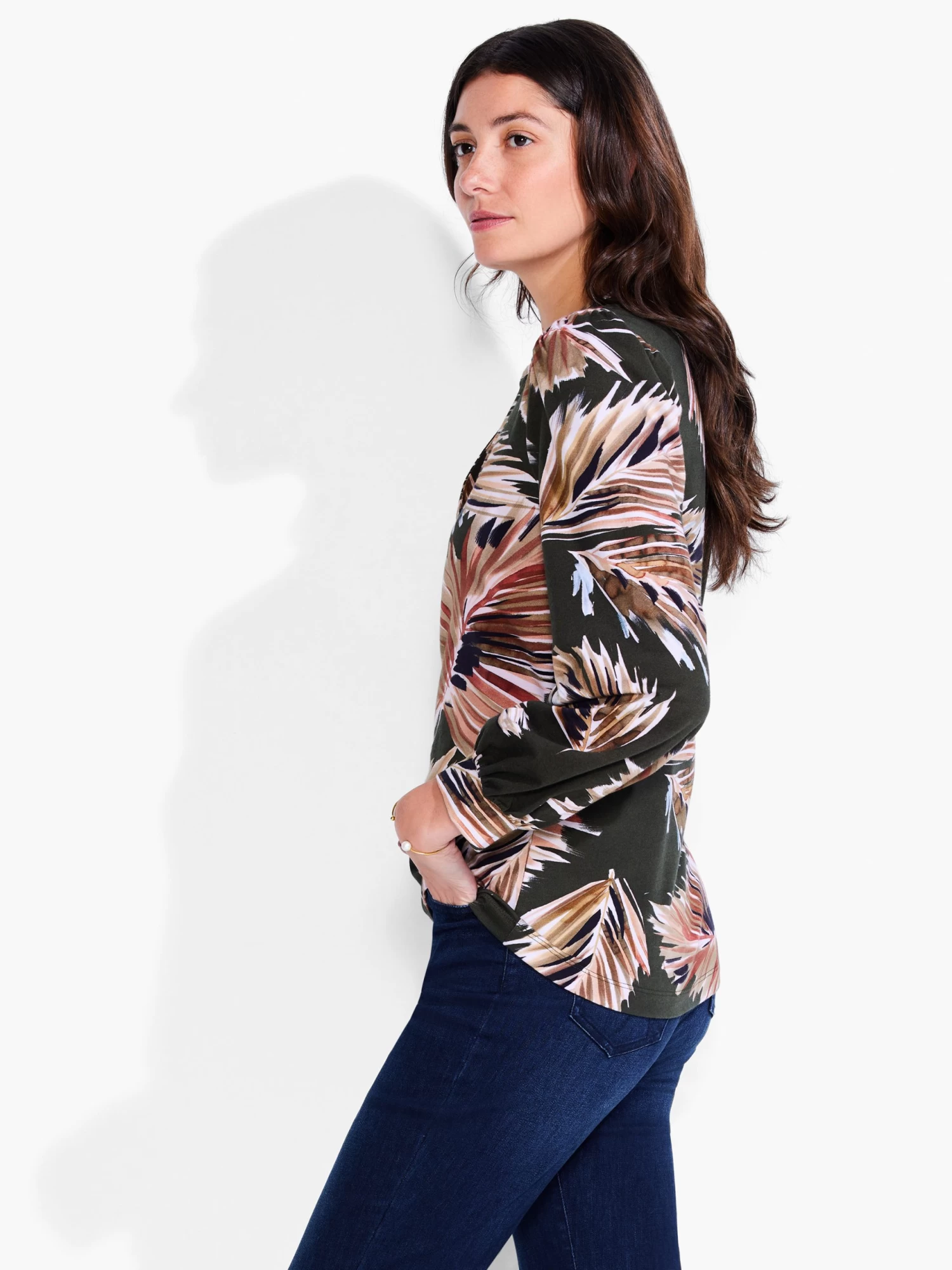 Our take on the classic Henley is not to be missed, especially when itÂ’s in the bold stylings of this botanic print. Made from our bestselling Perfect Knit fabric, this split neck silhouette is for those who like their layers on the louder side of the dial. With a stand collar and pleated puff sleeve and a hem designed to sit at the hip.