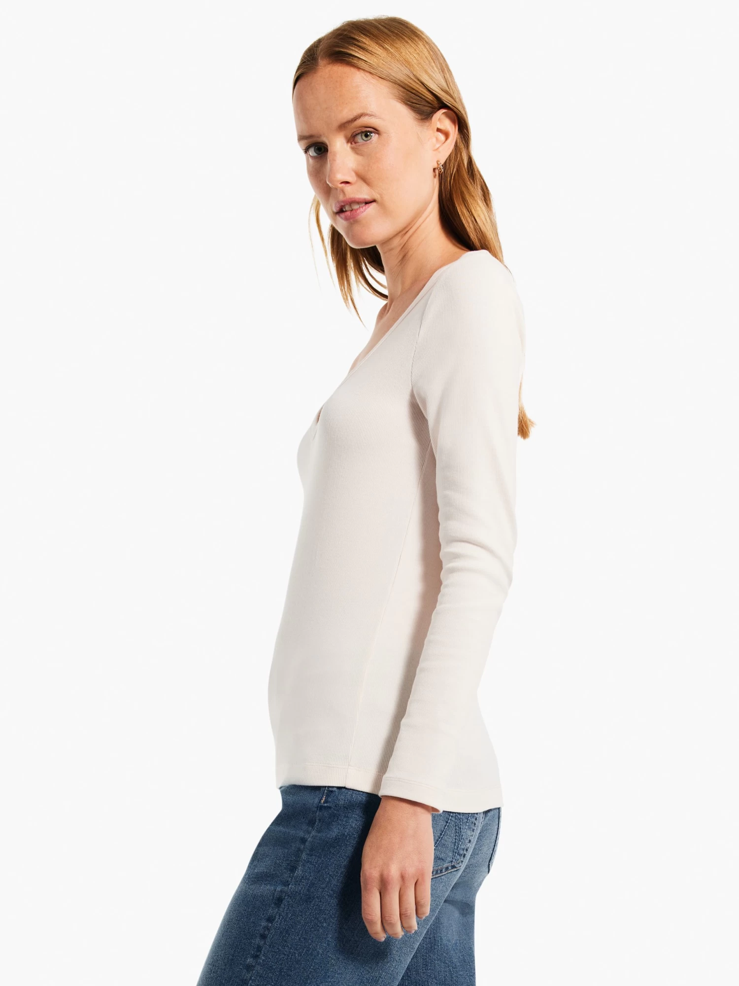 Our Perfect Knit fabric is the perfect (of course…) material for elevating the everyday basics, including this elevated V-neck tee with versatile long sleeves. The ribbed texture adds interest and depth to the monochrome look while the silhouette is designed to be slightly more form fitting. Use it to upgrade your layering or wear it on its own with denim for a clean simple look.