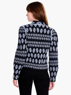 Pucker, pattern, perfection. This vintage-yet-contemporary textured fashion jacket features a gorgeous, placed iris motif created by our designers to be unlike anything else. Features a three-button front closure, puff sleeve silhouette, shawl collar, and a hem that sits at the hip. Mindfully Made from in a process that uses fully fashioned “no waste” knitwear.