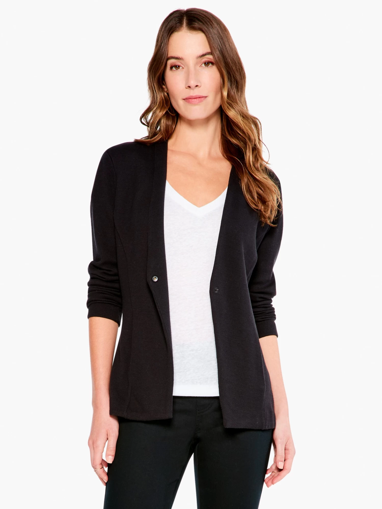 Get cozy with our version of the classic blazer in a soft, stretch knit that fits like a glove. High collar and nipped-in waist are ever so elegant AND universally flattering, while the hidden magnetic closure is pure magic.