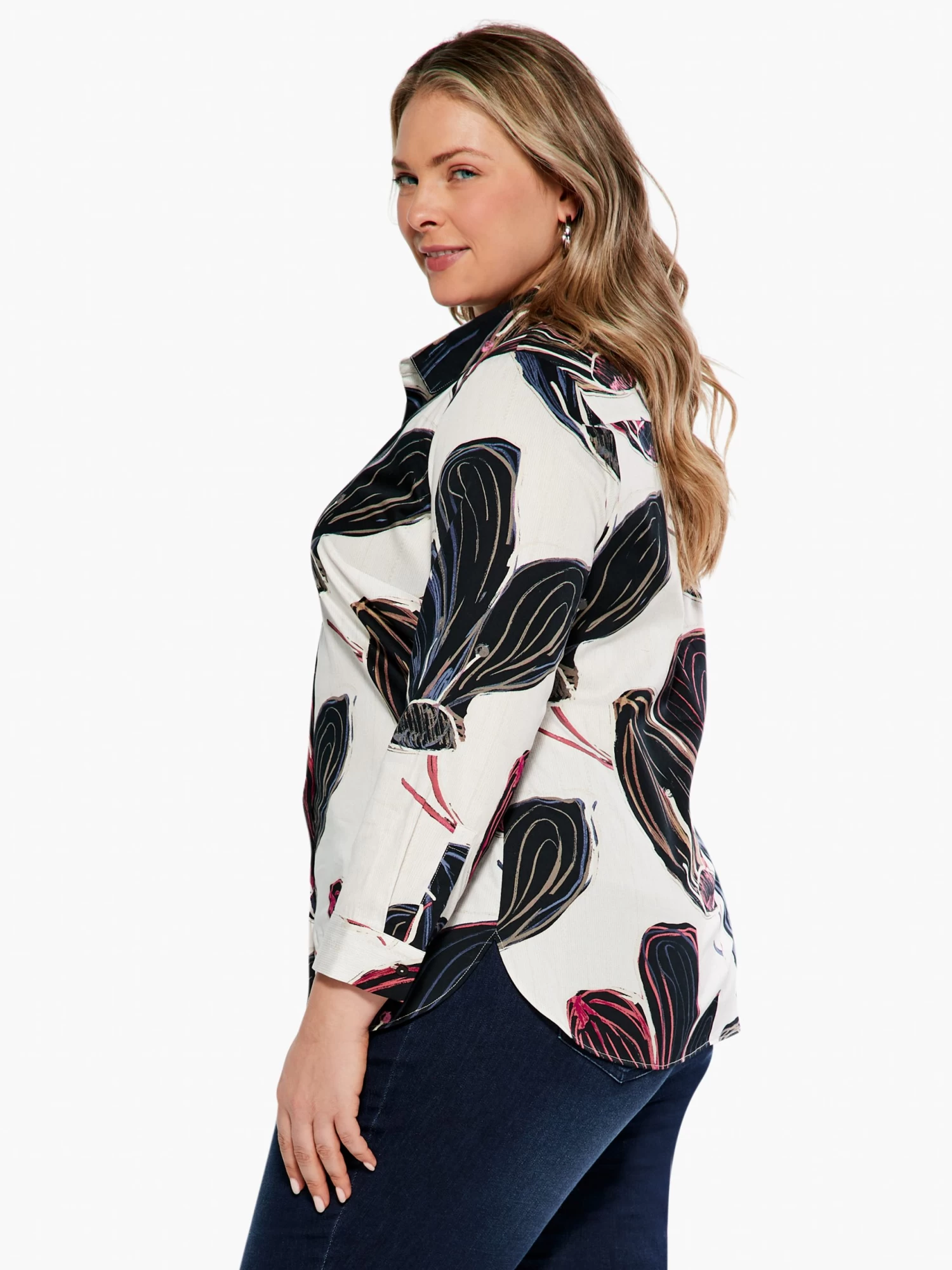A bold oversized floral print on a brilliant white background, this artistic, thoroughly modern look is ready to enter your rotation whether you’re dressing it up or down. A classic button-down silhouette with a button front, shirt collar, and full sleeves. Tuck it in or wear it loose where the hem will sit slightly below the hip. Made from 97% cotton with 3% spandex stretchiness added in.
