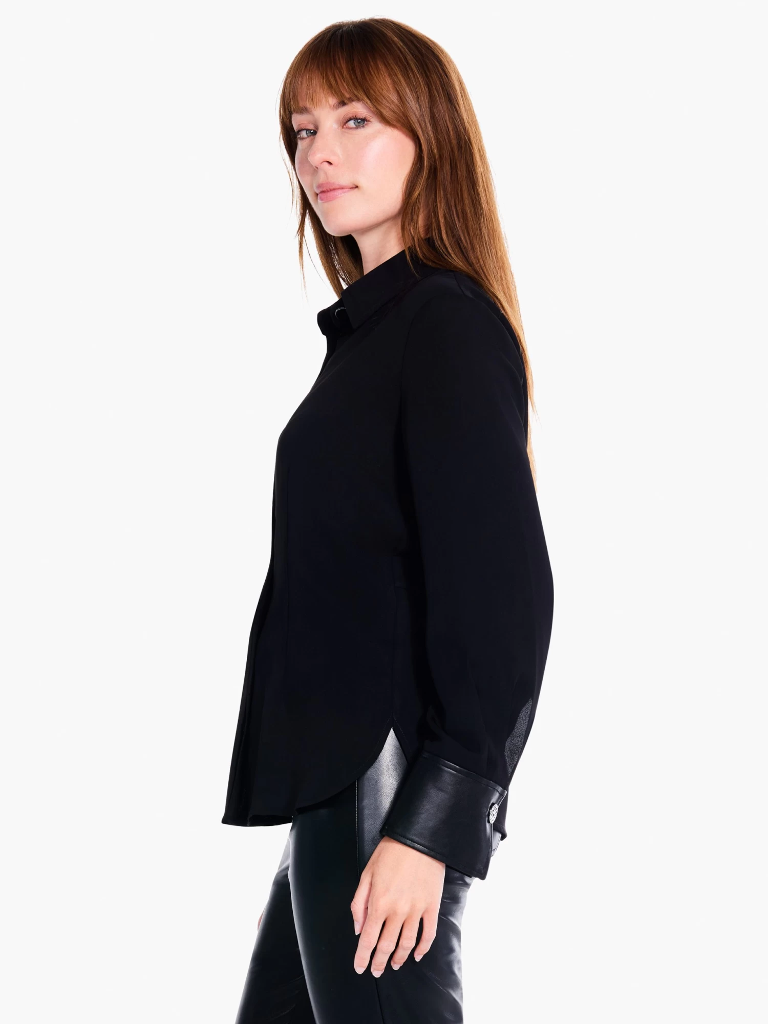 Everyone needs at least one black top, but not all are created equal. Subtle detailing sets this top apart from the rest of your closet. The vegan leather cuffs, hidden placket, button details, and contrast trim add some subtle chicness and a touch of character while remaining true to the legendary style. Designed for a regular fit, but with pleat details on the back that give it some feminine shape. With a little extra length that takes the hem below the hip.