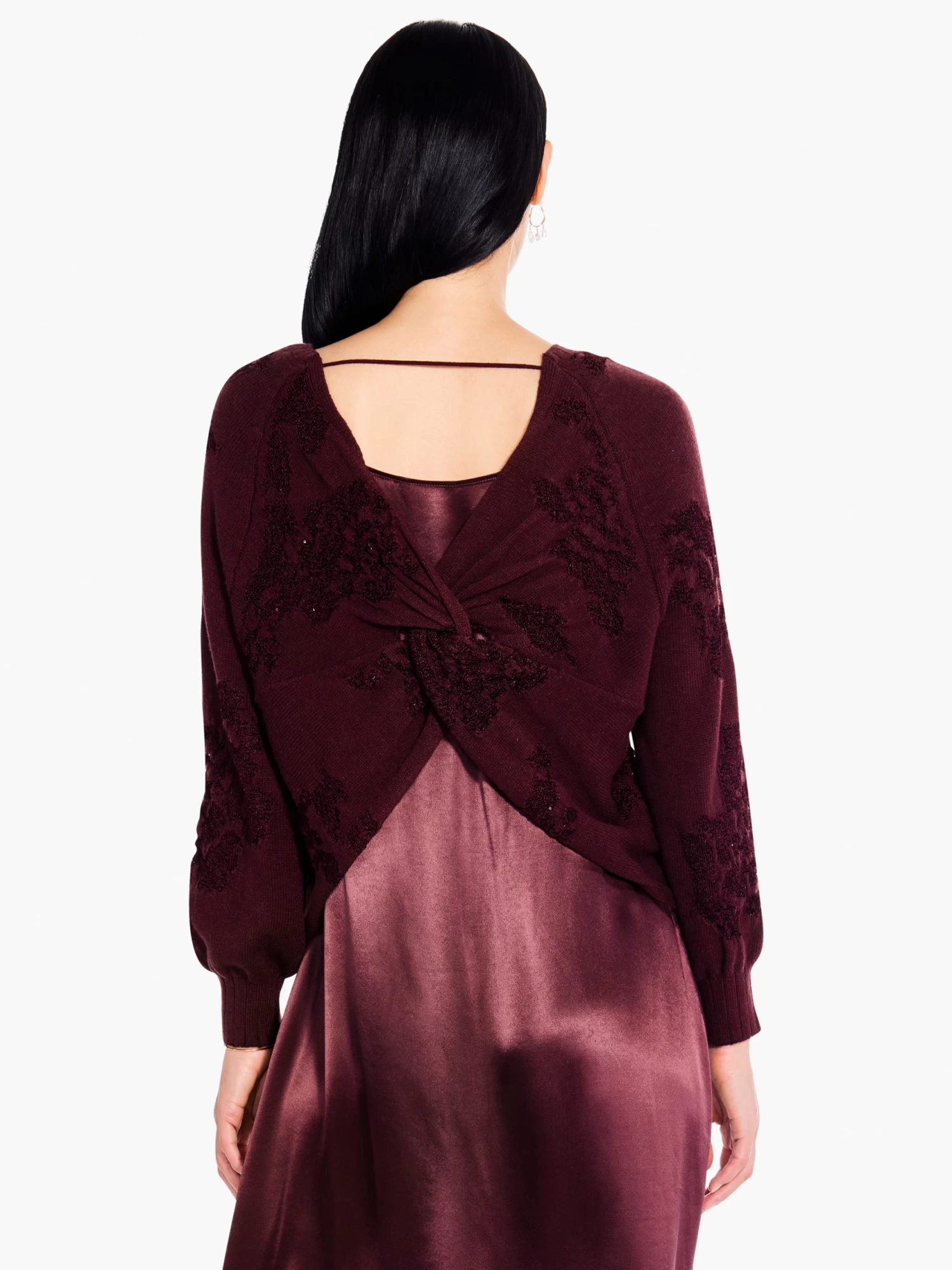 Wear it two ways, front to back or back to front. The perfect thing for wearing over a dress to add more coverage and create a unique head-to-toe look. The deep, eye-catching color also has scattered flecks of metallic material, giving it a touch of shine, but not too much: the sequins are only in the twists of texture to add some highlights. The feel is midweight with a pullover round neck and raglan sleeves.